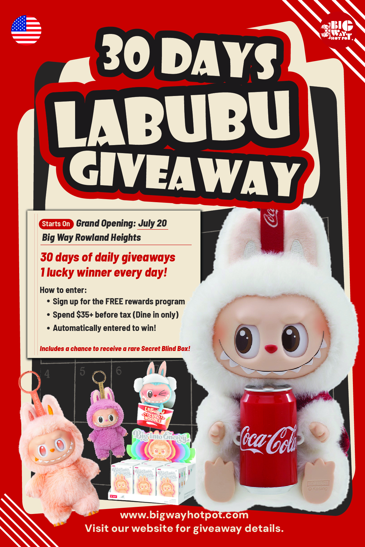 To celebrate the grand opening of our first U.S. location, we’re giving away a Labubu blind box every day for 30 days — exclusively to Big Way members!