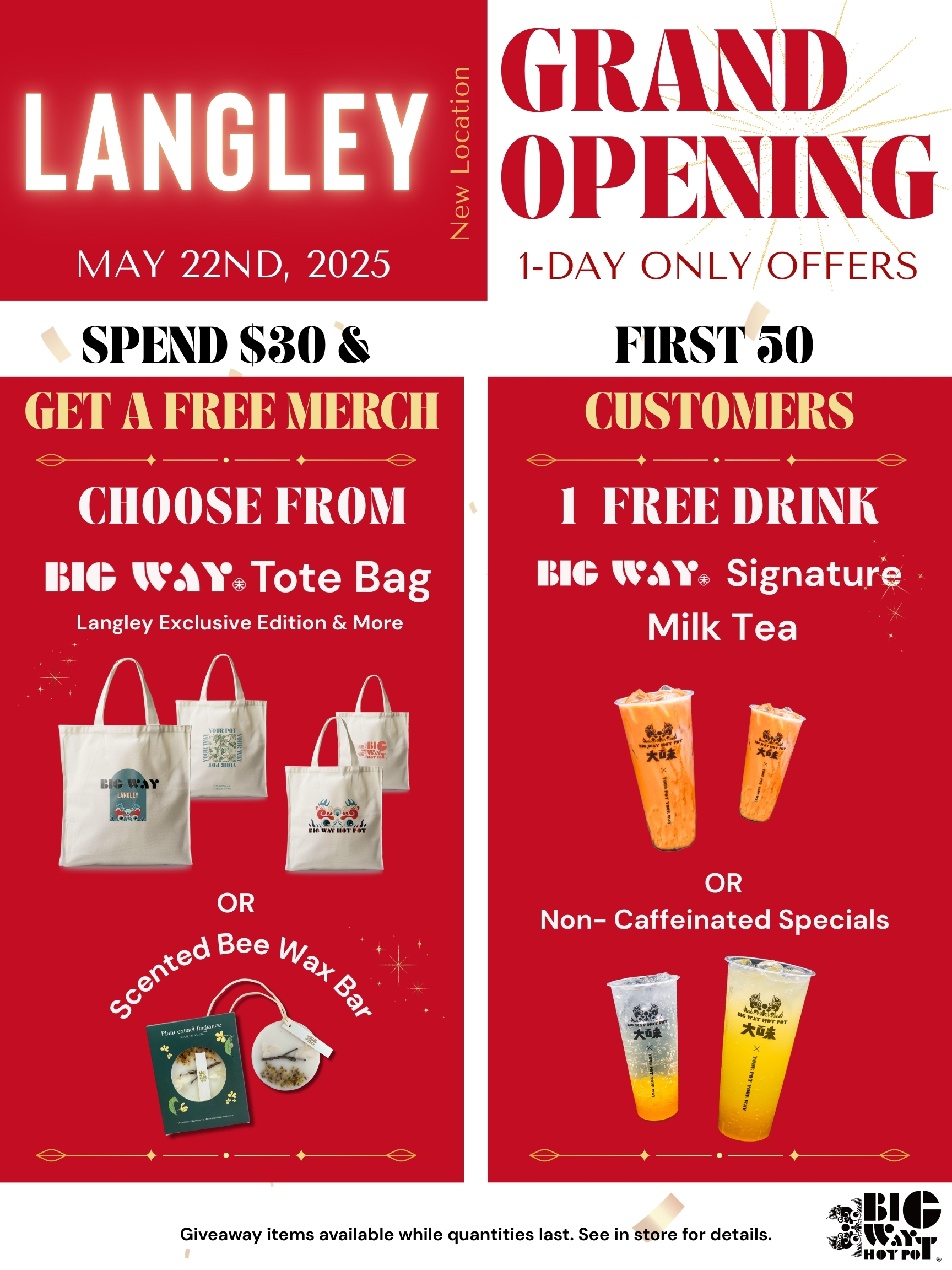 Spend $30 or more (before tax) in a single transaction and receive a free merch item of your choice: a Big Way Tote Bag or a Scented Beeswax Bar. Quantities are limited—arrive early to grab yours!