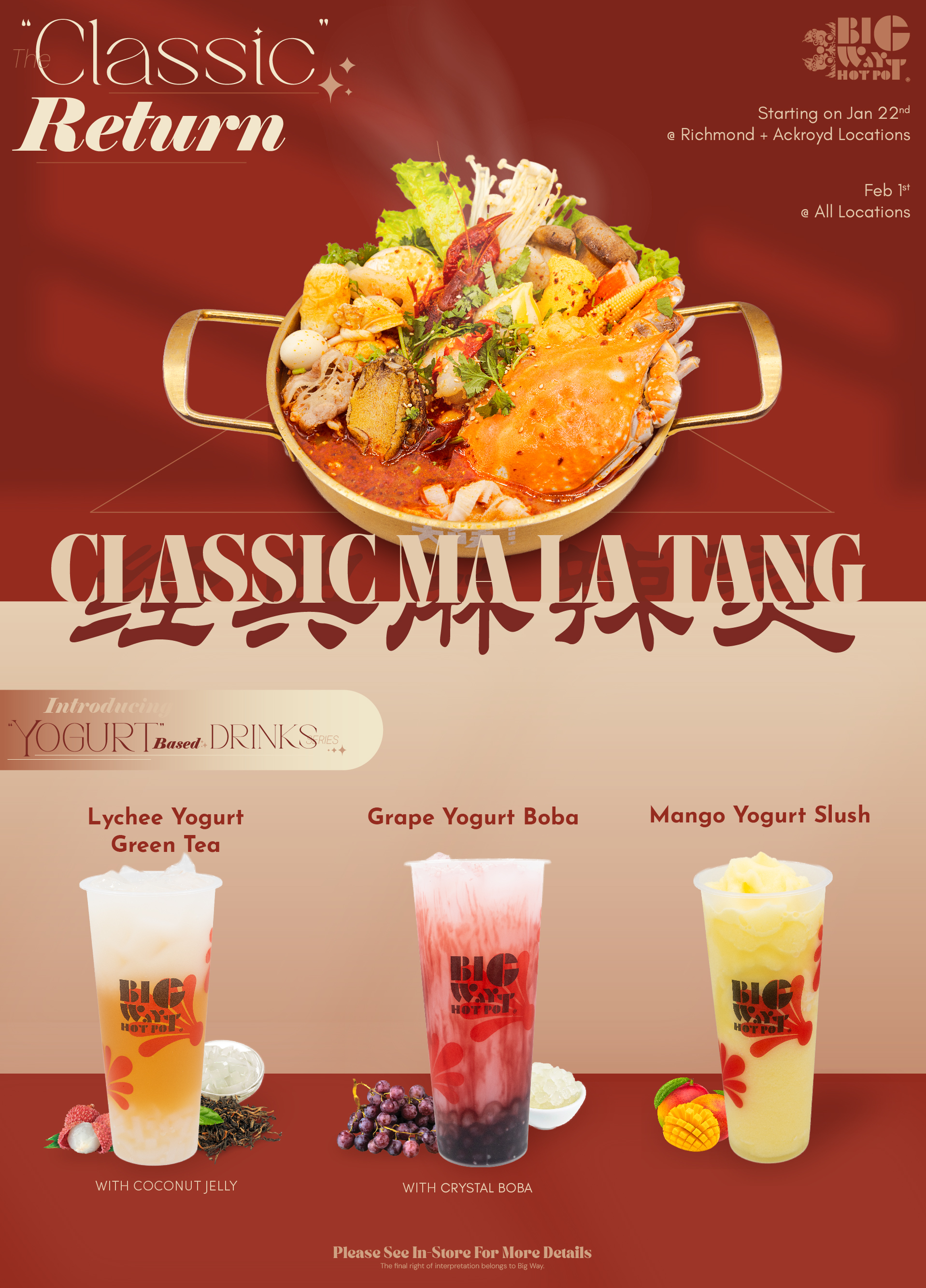 Big Way Hot Pot offers the ultimate self-serve hot pot experience that includes over 100 fresh and premium ingredients, as well as over 18 special broths and dry mixes to choose from, allowing you to create your hot pot in your own way!